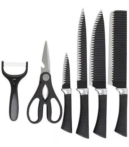 presentan un diseño innovador. Son duraderos y de alta calidad, con cuchillas afiladas recubiertas con anti adherente que facilitan su limpieza. Las robustas hojas de acero inoxidable son aptas para cortar carne, verduras, frutas, o lo que necesites. Este completo set de cocina también incluye un pelador con hojas de cerámica y unas tijeras de cocina multifuncionales.Características:- Set de cuchillos 5 Piezas- Mangos ergonómicos antideslizantes- Material de calidad superior- Hojas de Acero inoxidable- Fácil de usar y limpiarIncluye:- Cuchillo de carne de 20cm- Cuchillo de cocina de 20cm- Cuchillo rebanador de 20cm- Cuchillo multiusos- Tijeras de cocina- Pelador de cerámica
